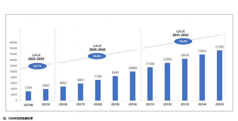 中国人工智能产业在未来 10 年将呈现出显著的增长趋势,并在全球市场中占据重要地位。从 2025 年到 2035 年,中国人工智能产业规模预计将从 3985 亿元增长至 17295 亿元,复合年增长率为 15.6%。中国人工智能产业将迎来爆发式增长,增速领跑全球。预计到 2030 年,中国 人工智能产业规模或将突破 1 万亿元。