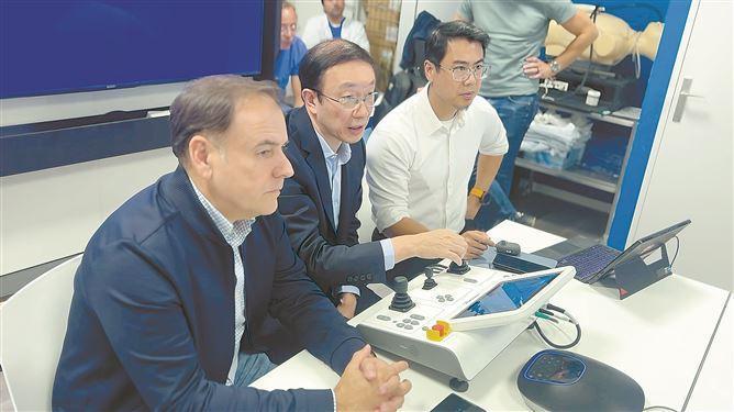 厦心医院王焱教授(左二)在法国操作机器人控制器。
