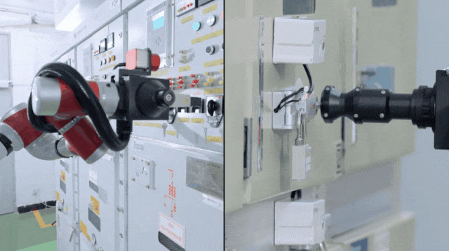 位于南方电网广东广州供电局的一座220千伏变电站高压室内,全球首台双臂协作巡操机器人“钧仪”正在进行高危环境下的巡检操作,通过高精度的双臂协作多线程并行作业,完成开关柜巡检、按钮操作、手柄切换等复杂任务,实现稳定高效的无人化巡检操作。