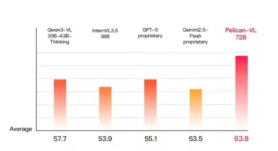 本次开源的 Pelican-VL 1.0 的核心优势在于深度整合海量数据与自适应学习机制,在由 1000+ A800 GPU 组成的集群上训练,单次检查点训练耗费超过 50,000 A800 GPU-小时;团队从原始数据中蒸馏出的包含数亿 token 的高质量元数据以做训练基石。基于上述优势,Pelican-VL 1.0 实现了在基线基础上性能提升 20.3%,平均超过Qwen3-VL 系列、InternVL3.5 系列等同级别开源模型 10.6%。
