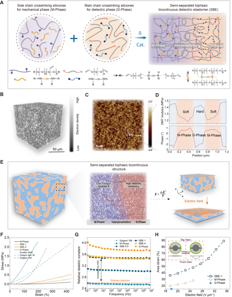 该策略利用了两种硅橡胶不同的交联机制,通过其异交联动力学的差异,引导两相在微米尺度自发组装。其中高介电常数的介电(D)相通过主链交联形成贯穿网络,而低杨氏模量的机械(M)相通过侧链交联构成力学骨架,形成边界融合、相互贯通的双相结构。这种微观结构既保持了材料的低杨氏模量,同时提高了其介电常数和击穿电场。实验表明,仅含10% D相的SBE材料,其杨氏模量约为10 kPa,相对介电常数为3.6,实现了高的机电灵敏度。基于此材料制备的人工肌肉,在无需预拉伸的情况下,在35 V/μm的电场下实现了90%的面积应变。