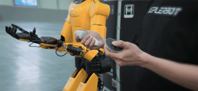 开普勒自研沉浸式全身遥操系统,是开普勒融合动作捕捉、低时延通信、力反馈等多技术,实现人类对机器人远程、沉浸、精准的 1:1 全身控制技术。它不仅是动作的简单复刻,更是 “操作执行 + 数据积累 + 自主进化” 的闭环系统 —— 当操作员通过遥操设备做出动作,30 公斤级双臂负载的 K2 大黄蜂能稳稳在高空中同步响应;当焊接器械遇到阻力,力反馈系统实时传递压力感;当焊缝出现火花飞溅,VR 头显同步呈现第一视角画面。