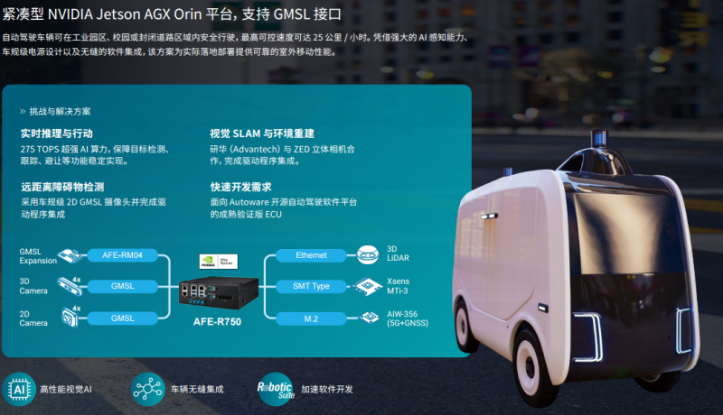 研华为AMR/AGV 打造了从底层硬件到上层调度的全栈方案,搭载多核 CPU、高性能 GPU/NPU 异构计算架构,支撑亚秒级无线漫游、1 PPS 高精度时间同步、宽电压输入与双重 TVS 防护,满足高速移动、动态场景下的实时控制需求。通过相机与多传感器融合技术,实现 MIPI/GMSL 摄像头一键适配、多模态数据精准对齐,并依托 Cogniteam 车队管理平台、Autoware 开源自动驾驶平台,打造从室内仓库导航到户外混合交通的全场景 AMR 解决方案,已成功落地厂内物流、场域末端配送、AI 智能除草等场景,实现物料运输、农业除草的自动化、智能化升级。