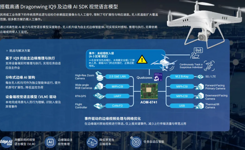 针对无人机行业电池续航、定位导航、软件碎片化等痛点,研华打造了以能效优化、安全连接、AI 就绪、生态标准化为核心的无人机开发底座,集成 SLAM、激光雷达、IMU 等技术,适配无 GNSS 信号的室内外全场景定位;支持 5G/Wi-Fi/LoRa 多协议通信栈与自适应故障切换,保障超视距作业的稳定连接。推出超视距自主管道巡检、视觉推理自主巡逻无人机解决方案,依托边缘 AI 算力实现缺陷实时识别、异常行为自主判断,广泛应用于基础设施巡检、公共安全巡逻、农业巡检等场景,实现无人机从 “人工操作” 到 “自主智能” 的跨越。