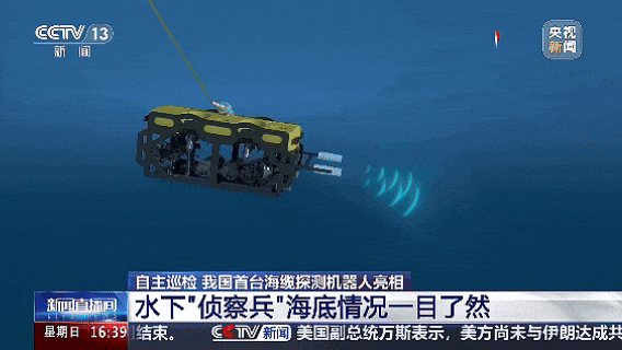通过这个观察窗口,我们可以看到这个海缆探测机器人在水下作业的情况,它就像是一个水下侦察兵,每小时可以行进5到7公里,这就相当于我们人类快走或慢跑的这样一个速度,它最大的作业水深可以达到300米。我们可以看到,在伸手不见五指的水底它可以打开灯光,海底的情况一目了然。