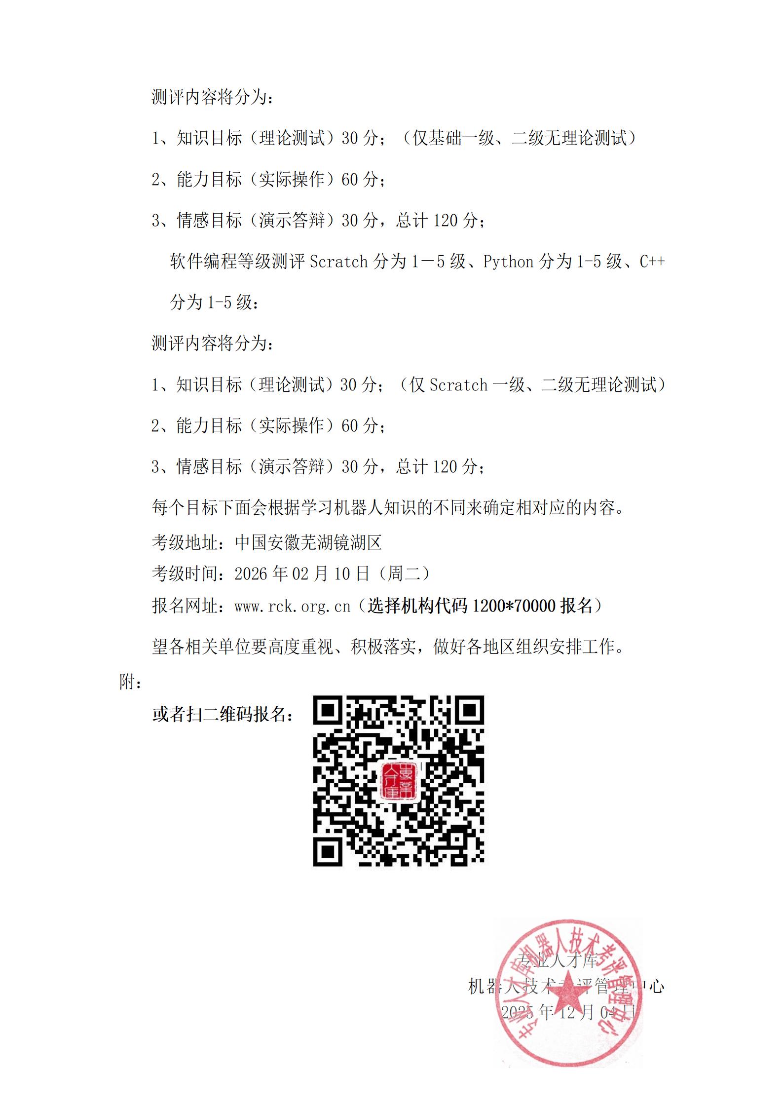 (1200-70000)安徽芜湖站——机器人技术等级测评(2026年02月10日)